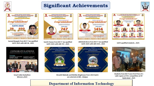 The department of Information Technology at JSPM's Rajarshi Shahu College of Engineering is established in the year 2001 with intake of 45 students which has been increased to 120 students in year 2017. The basic aim of the Department is to provide the conducive teaching learning environment with core fundamental concepts and latest technologies through theory and practical. The department has state of the art infrastructure, well qualified and experienced faculty members to cater the students. We are strived to shape up the career of the students to excel in the competitive world through strong academic environment.