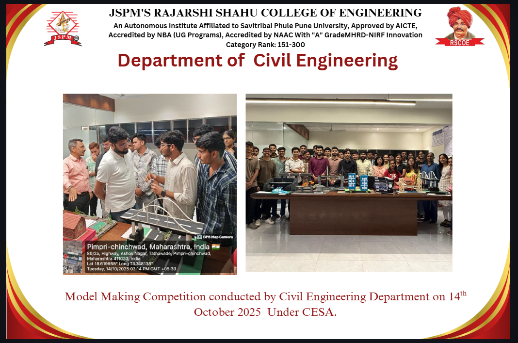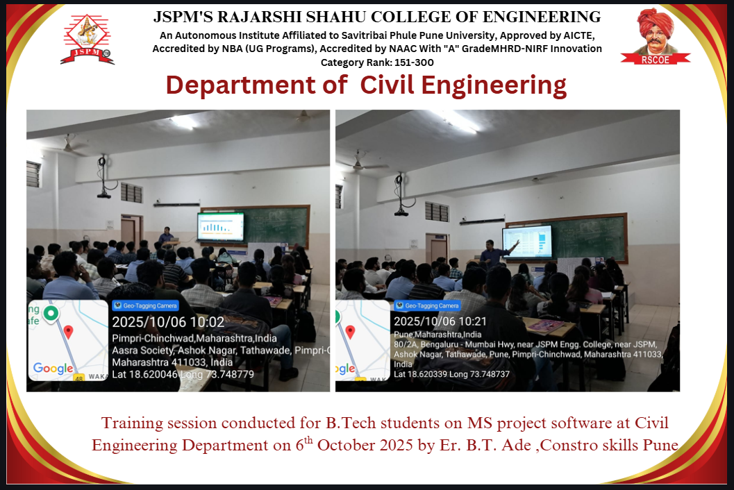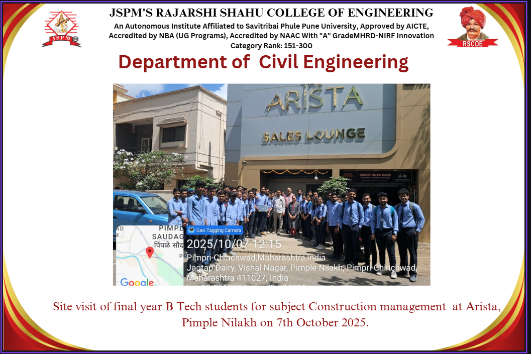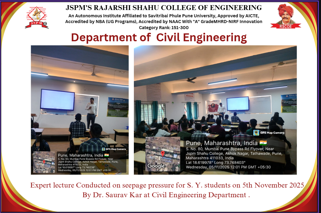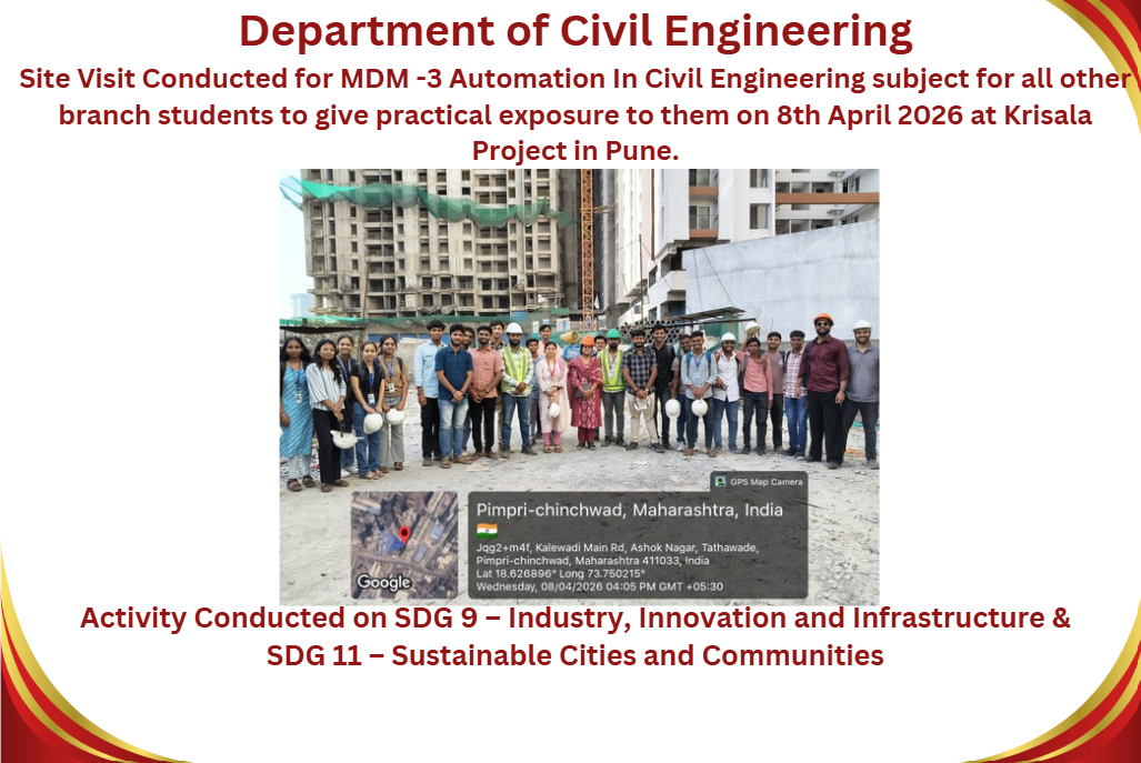 M.Tech Coordinator, Department of Civil Engineering RSCOE organized Induction Programe for F.Y.M.Tech students. Dr. Sushma Kulkarni, the Vice Chancellor of NICMAR University, Pune graced the event as Chief Guest.